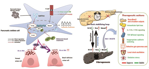 自上世纪70年代Konopka和Benzer首次在果蝇中发现第一个钟基因period突变后,关于生物钟相关的理论研究逐渐系统丰富,并衍生出专门的“时间生物学(Chronobiology)”,拉斯克奖、诺贝尔奖也先后授予这一领域的杰出工作者们。但是需要看到,在生物钟逾40多年的研究历程中始终存在转化与应用的巨大鸿沟。迄今,通过调节生物钟/昼夜节律来治疗疾病的可能性仍然面临挑战,生活方式及行为管理、时辰疗法(chronotherapy)和药物干预均是潜在的方法。当本文作者使用药物包括Rora激动剂SR1078等时,其重启胰腺生物钟的作用可显著加强其在体内的效力从而明显改善CP进程、减轻纤维化。这些研究成果进一步丰富了胰腺生物钟的理论框架,并为后续研究、开发作出铺垫。