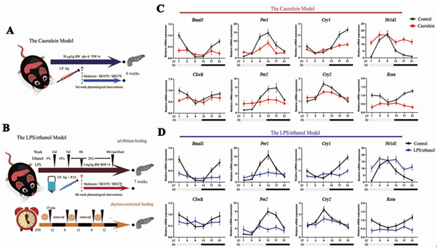 图1.两种独立的慢性胰腺炎动物模型都显示了该病变对生物钟核心基因表达的影响。