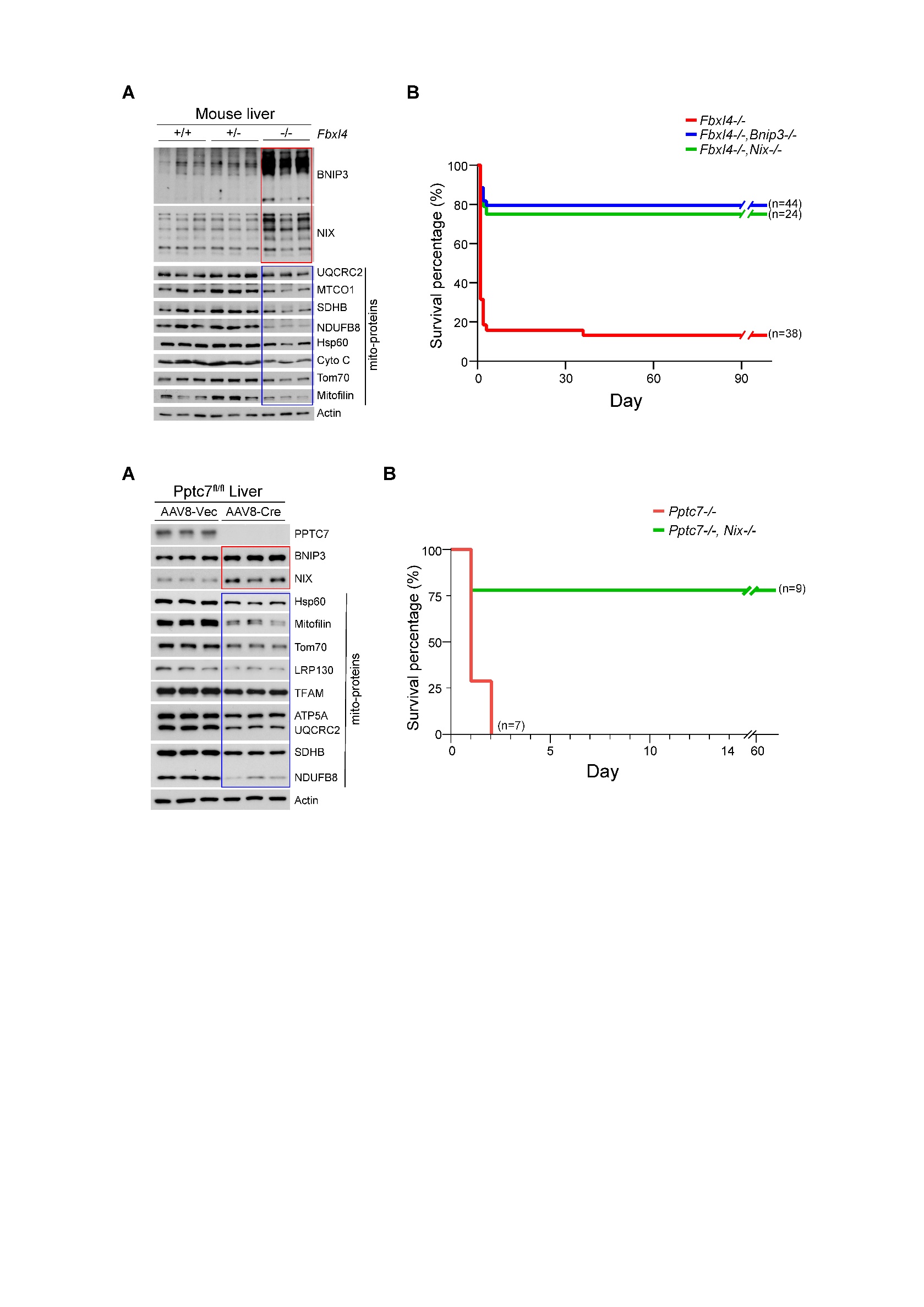 图1. PPTC7缺失过度激活BNIP3和NIX依赖的mitophagy,造成线粒体数量减少和小鼠死亡。A,Pptc7 -KO升高小鼠肝脏中mitophagy受体BNIP3和NIX的蛋白水平(红框)并导致其他线粒体蛋白减少(蓝框)。B,小鼠生存曲线。