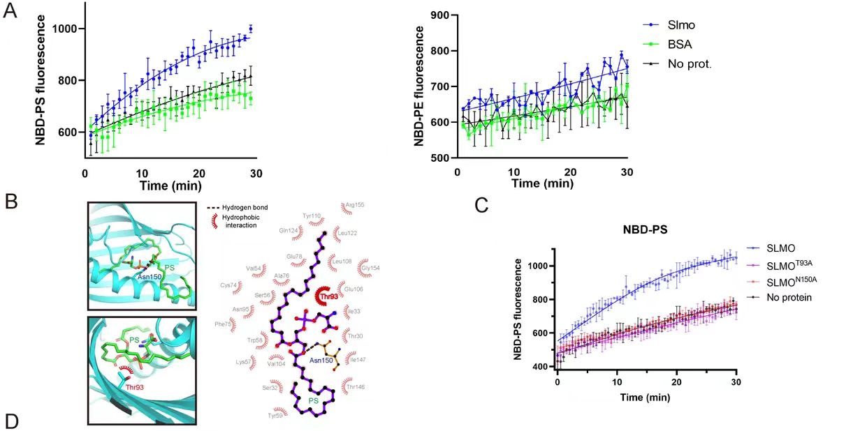 图3 SLMO具有体外转运PS的能力,T93和N150是结合PS的关键微位点