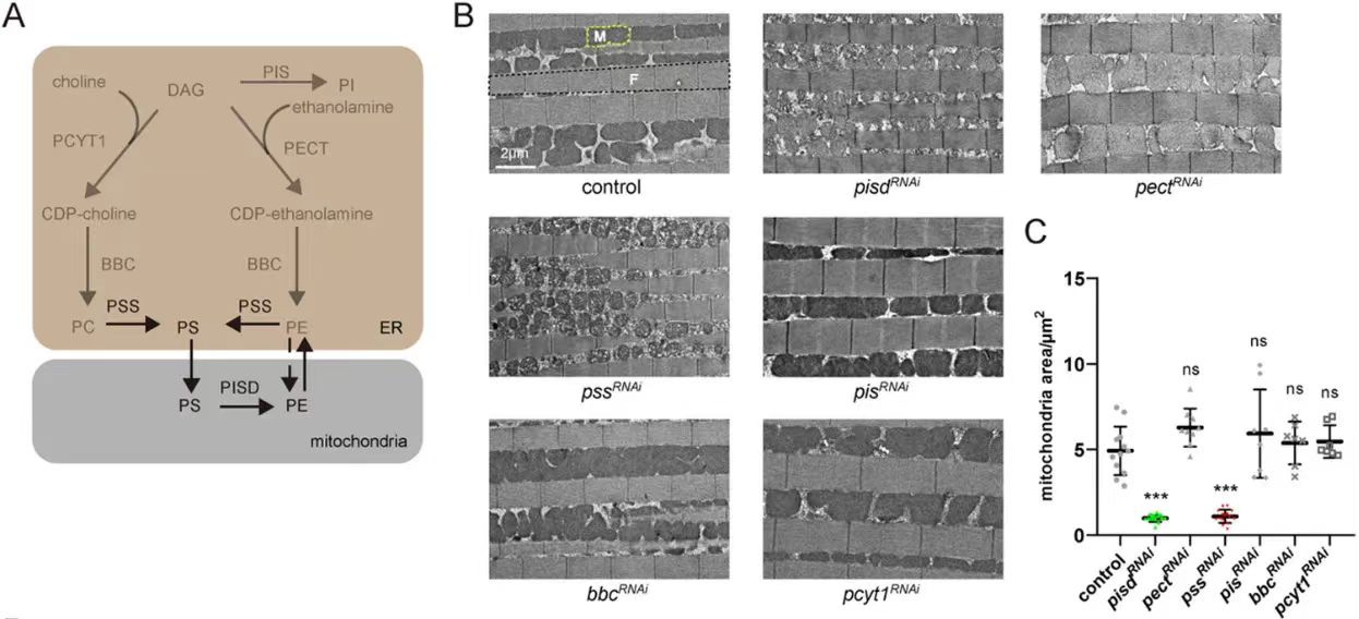 本研究以果蝇为模型,首先在果蝇的飞行肌细胞中敲低各种磷脂合成的关键酶pcyt1,bbc,pect,pss,pisd,pis,验证了敲低之后的转录水平以及对应磷脂的水平。发现只有pss和pisd的缺失会造成线粒体体积变小的表型。PSS是定位在内质网中由PC和PE生成PS的关键酶,而PISD是线粒体中的磷脂酰丝氨酸脱羧酶将PS转化成PE。这说明PS和PE是维持线粒体形态正常的关键磷脂。