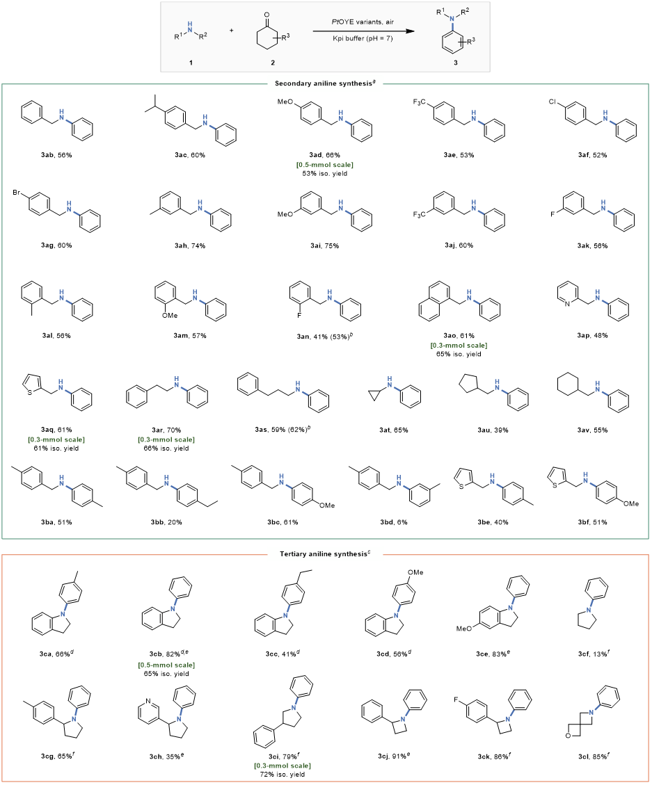 在确定了最优酶突变体和最适反应条件之后,研究人员系统地研究了这些苯胺合成酶的底物适用范围。结果表明,这种生物催化方法展示出了良好的底物兼容性和官能团耐受性,可以将不同取代的苄胺、含杂环的伯胺以及部分烷基胺转化为相应的二级苯胺;也可成功地将部分仲胺转化为三级苯胺。此外,不同取代模式的环己酮也能参与反应。在此基础上,作者选取多个底物进行了制备规模的酶促反应,成功合成出如3ad、3ao等多种苯胺衍生物,进一步验证了该方法的应用潜力。