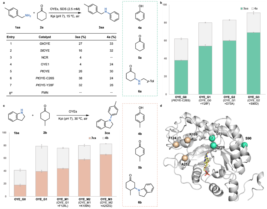 基于这一发现,研究人员随后利用OYE_G0作为起始模版,分别针对二级苯胺和三级苯胺的合成过程进行了多轮蛋白质工程化改造与筛选。通过多个活性位点的定点饱和突变以及随机突变,作者最终分别获得催化合成二级苯胺的突变体OYE_G3以及催化合成三级苯胺的优势突变体OYE_M3。