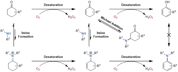 / 北京生命科学研究所刘臻课题组在国际期刊《Angewandte Chemie International Edition》发表了题为“An Enzymatic Platform for Aniline Synthesis through Oxidative Amination”的研究论文。通过改造该实验室开发的黄素(FMN)依赖酶PtOYE(源自Parageobacillus thermantarcticus),这一催化体系可以有效地将胺类化合物和环己酮衍生物组合,通过氧化胺化的机制制备多种二级和三级苯胺。针对结构不同的胺类底物,作者分别通过两条定向进化路径获得了各自的优势突变体OYE_G3和OYE_M3,提高了酶催化的效率并抑制了环己酮直接脱氢生成苯酚的副反应。通过多组动力学实验,作者系统研究了这类苯胺合成酶的催化机制。实验表明,优势突变体不仅提高了亚胺中间体芳构化的催化效率,且降低了环己酮直接脱氢生成苯酚的活性,形成了有利于目标反应的协同效应。