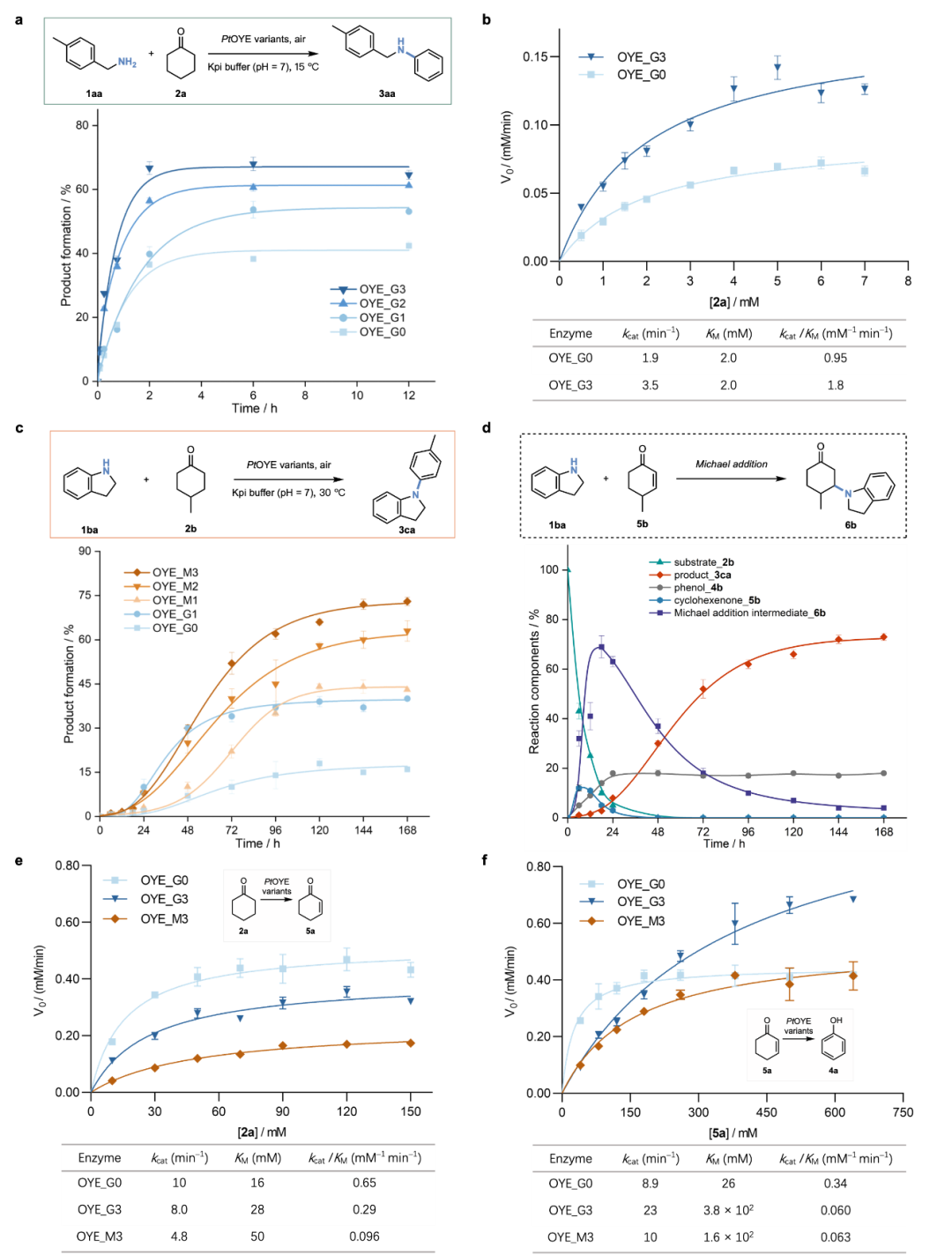 为了深入了解这一酶促反应的机理,作者对生物催化脱氢偶联反应进行了一系列动力学研究。首先,研究人员使用二级苯胺合成酶进化谱系中的各个变体针对3aa的酶催化合成进行了时间进程实验,并通过Michaelis-Menten曲线分析酶的动力学参数。实验结果表明定向进化引入的突变有效地提高了苯胺合成酶OYE_G3的kcat。随后,作者用类似的方法对三级苯胺3ca的合成反应进行了时间进程研究。与二级苯胺合成体系不同是,三级苯胺合成反应的前期会发生可逆的aza-Michael加成过程形成中间体6b,因此反应会显示出明显的诱导期(induction period)。为了明确探究酶活性是否从环己酮脱氢转移到亚胺脱氢,作者比较了最初变体(OYE_G0)与定向进化谱系的两个最终变体(OYE_G3和OYE_M3)生成苯酚的活性变化(图4e和4f)。实验结果表明,进化后的变体对于苯酚生成过程的催化能力显著下降。