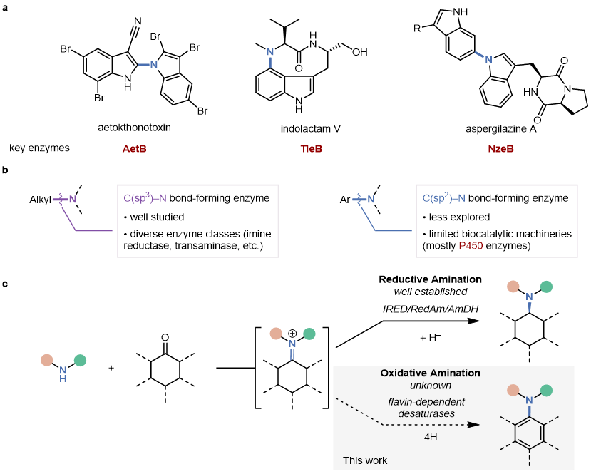 基于黄素依赖酶的独特脱氢催化机制,作者开发了非天然的苯胺合成酶系统,可以有效地制备二级与三级苯胺衍生物。这种酶催化系统可以通过后续的进化进一步提高催化效率,并通过计算与实验结合的方式完善机制研究。总体而言,这项工作为苯胺化合物的合成提供了高效、环境友好的生物合成策略,在生物催化和药物开发等领域具有重要的应用前景。
