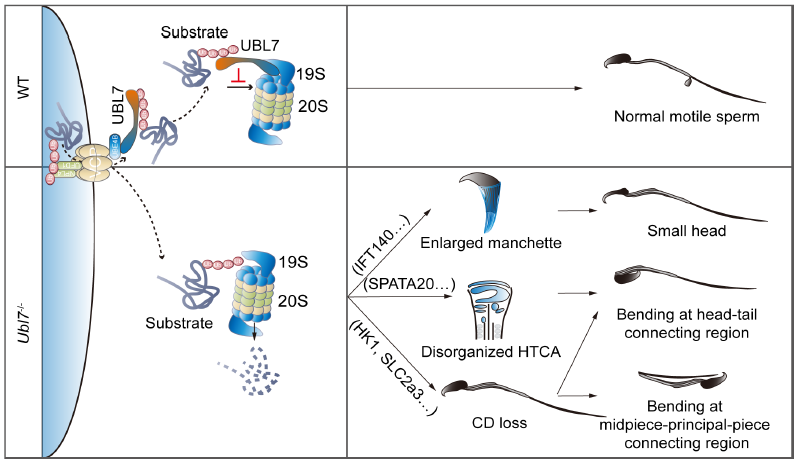 圆形精子发育成为长形精子的后期变形过程中,由于转录过程的停止,蛋白质稳态的调节起到重要的作用。前人研究发现许多泛素-蛋白酶体系统的成员对精子后期变形十分重要,但大多研究的分子机制不明。本研究发现UBL7作为泛素-蛋白酶体系统中,负责将底物从VCP复合体转运到蛋白酶体上的“穿梭因子”,能够保护一些关键底物不被过度降解,从而保证精子结构的正常发生。