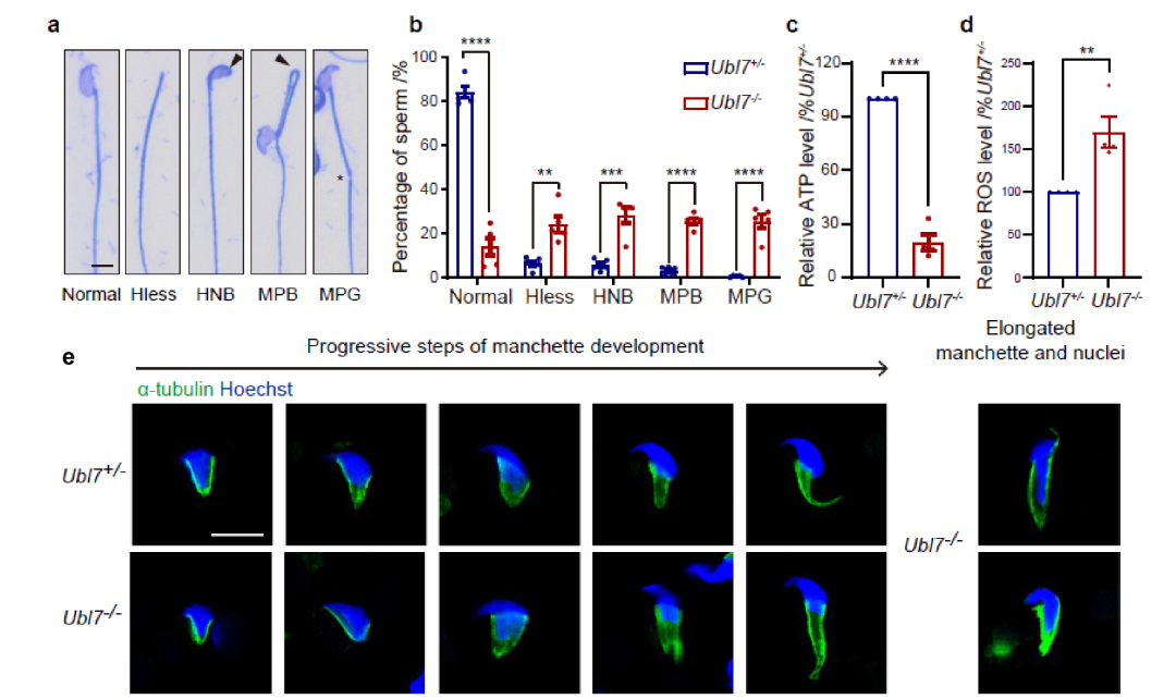UBL7是一个高表达于小鼠睾丸的蛋白。Ubl7敲除后,雄鼠不育,精子形态明显异常,具体表现为精子头直径明显小于对照,精子尾在头尾连接处和中段-主段连接处异常弯折和断裂。进一步探究发现,导致敲除小鼠精子形态异常的原因是一些精子特殊结构的异常,例如Manchette异常延伸,精子头尾连接器结构混乱,胞质小滴体积减小等(图1)。