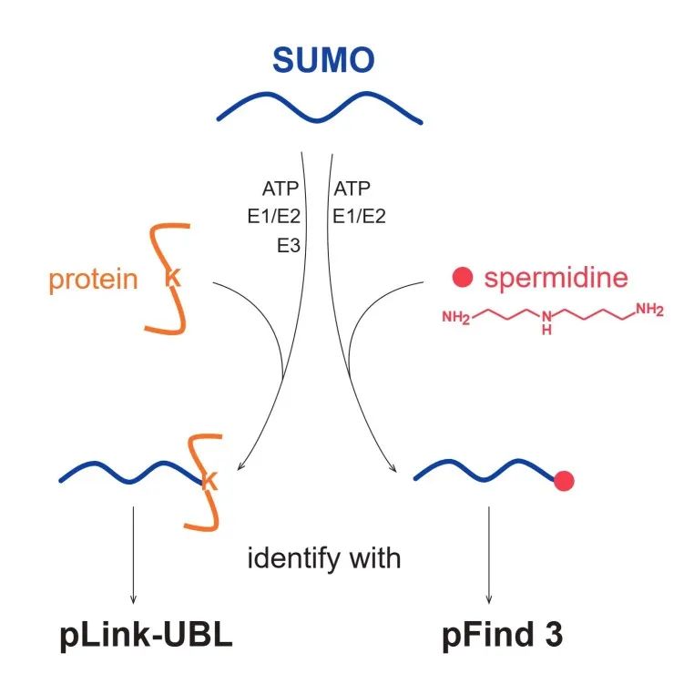 总结,本文开发了两套鉴定类泛素修饰的质谱方法,分别针对蛋白质和小分子底物,并发现SUMO可以共价可逆修饰亚精胺(图3)。