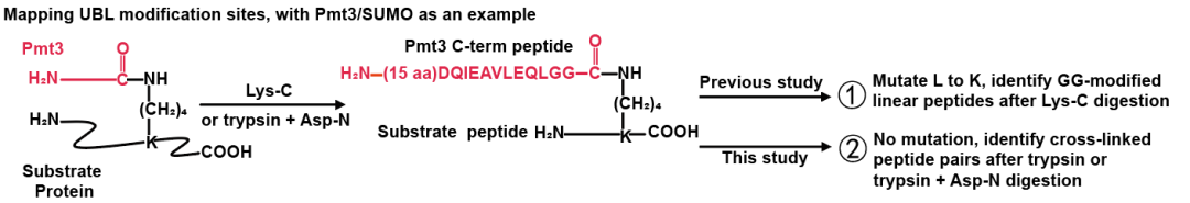 一,作者以不对UBL蛋白序列进行突变为前提,在交联肽段搜索引擎pLink的基础上开发了pLink-UBL,专门用于鉴定UBL在底物蛋白上的修饰位点。以pLink-UBL为核心技术的质谱分析方法将UBL修饰视为内源性蛋白质交联,经蛋白酶酶切后产生特征性交联肽段对。其中,一条肽段来自UBL的C-末端,序列已知;另一条来自底物蛋白,含有一个被UBL修饰的赖氨酸残基,序列未知(图1)。pLink-UBL利用该特征以及对UBL修饰肽段的碎裂规律的把握,实现了快速、精准、灵敏的UBL修饰鉴定,与其他软件相比展现出明显的性能优势。