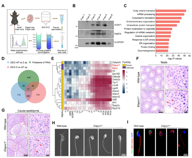 为探究顶体发生过程中PAV融合的关键调控因子,研究团队从成年小鼠圆形精子中分离PAVs,通过蛋白质组学分析鉴定到一个新的睾丸中高表达的膜蛋白ELAPOR1。功能研究显示,Elapor1敲除雄性小鼠完全不育,精子呈现头部异常、顶体缺失、运动能力下降、线粒体鞘结构紊乱等表型,这与人类不育症中的圆头精子症(Globozoospermia)的病理特征相似,说明ELAPOR1在顶体发生中具有重要功能。