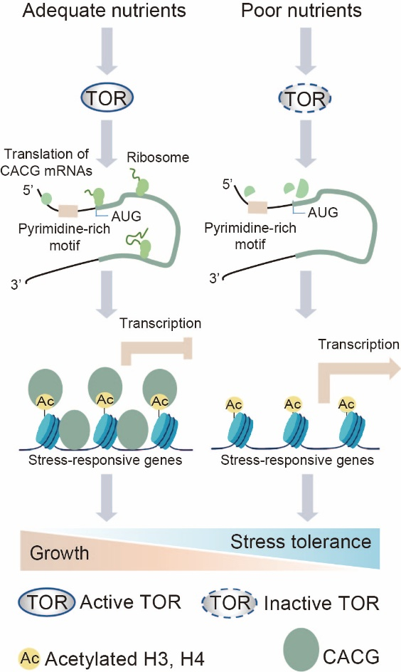 综上所述,该研究揭示了CACG复合体作为响应营养条件的关键效应因子的作用机制。在营养充足条件下,TOR激酶促进CACG mRNA的翻译,CACG可直接结合于富集组蛋白乙酰化修饰的逆境应答基因,抑制其转录,从而使植物将更多能量用于生长。相反,在营养缺乏条件下,TOR激酶活性降低,导致CACG mRNA翻译受阻,削弱了CACG对逆境响应基因的转录抑制作用,使植物在生长受抑制的情况下增强对逆境的适应性(图 3)。这些发现揭示了植物在染色质水平上调控生长与抗逆平衡的分子机制,为培育高产且抗逆性强的作物提供了重要理论依据。鉴于该研究的重要性,《Nature Plants》杂志同期配发了题为“A nutrient-responsive chromatin complex balances growth and stress tolerance”研究简报,对该工作进行了重点推介。