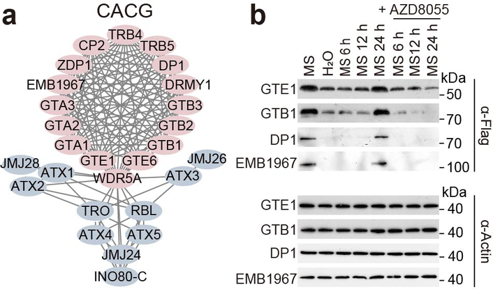 该研究在拟南芥中对分离到的染色质相关复合体进行质谱分析鉴定,发现一个植物特异的多亚基蛋白复合体,并命名为CACG (chromatin-associated complex for growth)。该复合体包含两个功能冗余的组蛋白乙酰化修饰的识别蛋白:GTE1和GTE6。进一步利用分子筛、体外pulldown及酵母双杂交等实验证明了该复合体各亚基之间的相互作用(图 1a)。